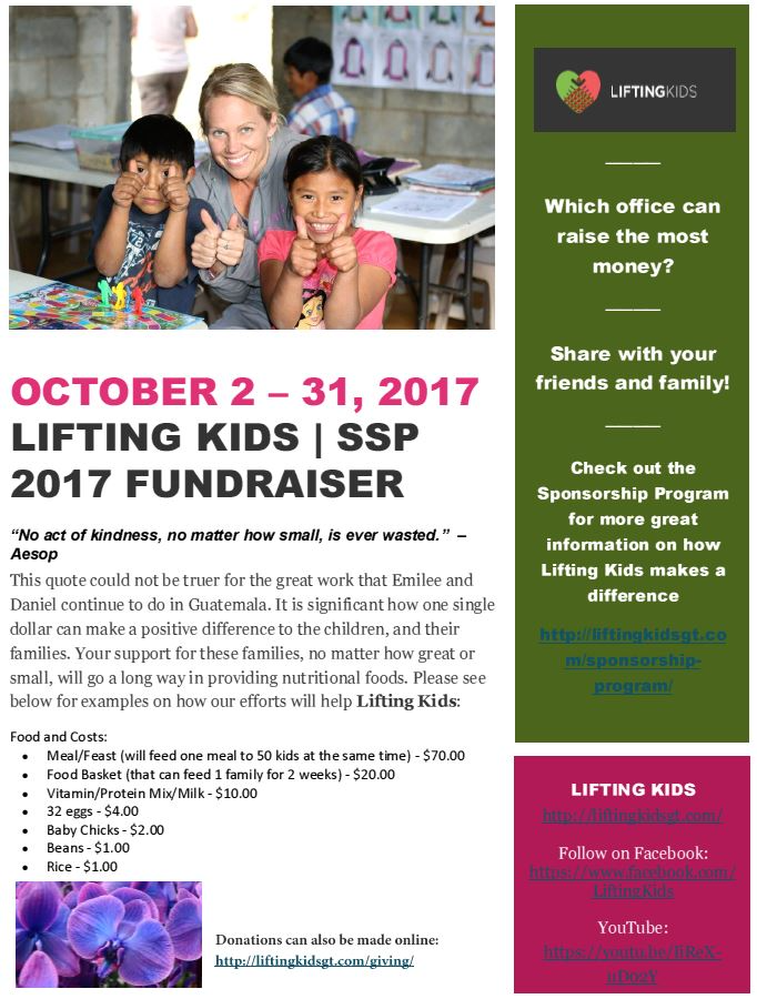 We are excited about our fall volunteer project – raising money for Lifting Kids, a non-profit serving kids in Guatemala. A little background on why this organization is so special to us at SSP. Jeff Stagnaro’s daughter, Emilee, and her husband, Daniel, founded this non-profit in 2014. Daniel is Guatemalan and they met while doing mission work in Guatemala. Lifting Kids is a Christian after-school program in San Mateo, Guatemala (an isolated mountain village). The program serves meals to kids in poverty, about 60 kids. The kids also attend classes in Bible, math, reading and English. We are raising money to provide food, school supplies and clothing for the kids.
